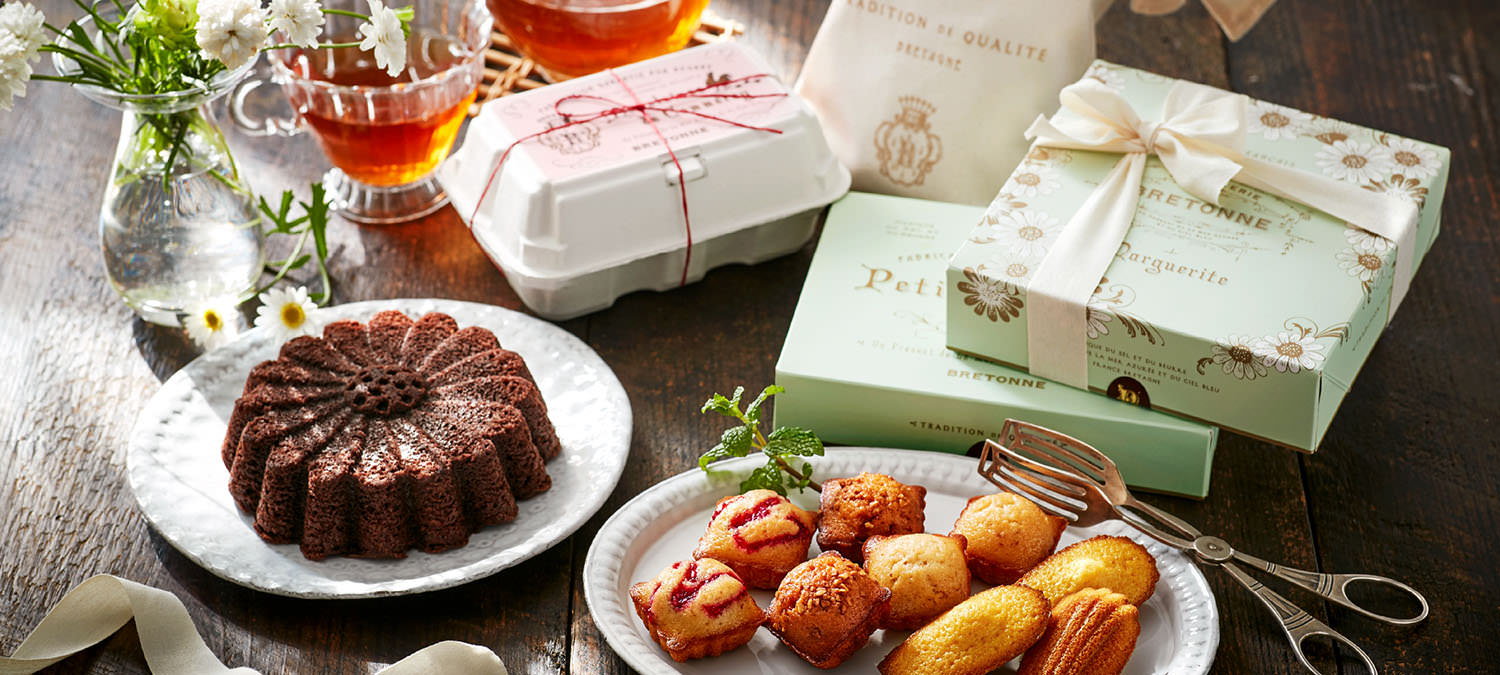 マーガレットの形のショコラケークや、小さく焼き上げたフィナンシェ・マドレーヌなど、