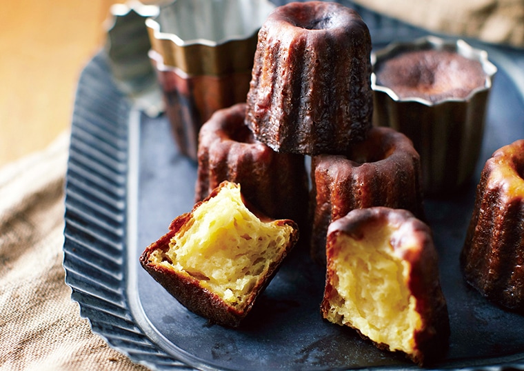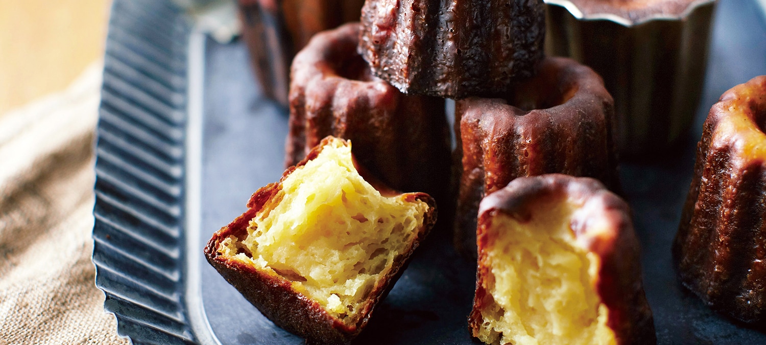 カヌレはフランスのボルドー地区が発祥のお菓子で、正式名称は「カヌレ・ド・ボルドー(Cannele de Bordeaux)」といいます。ブルトンヌのカヌレは、外皮はカリッと、中はもっちりとした食感が自慢のクラシックなおいしさです。銅型に、蜜蝋をしっかりコーティングし一時間程じっくりと焼き上げています。中には、バニラとラム酒が香るカスタード生地の幸せな美味しさが隠されています。紅茶やコーヒーはもちろんですが、ボルドーで楽しまれているように赤ワインと合わせていただくのもおすすめです。