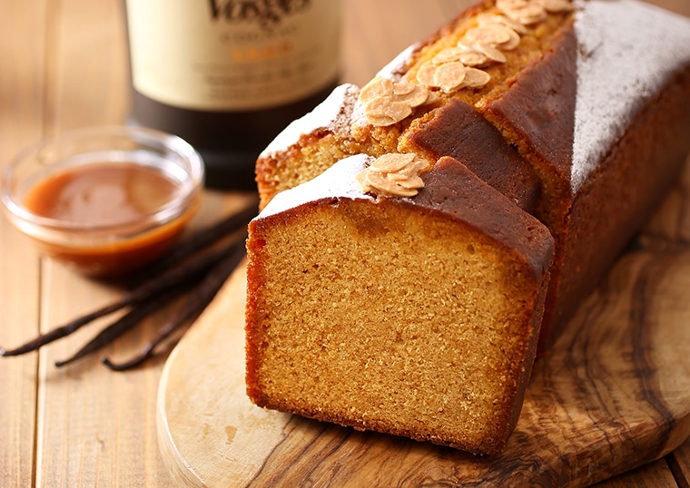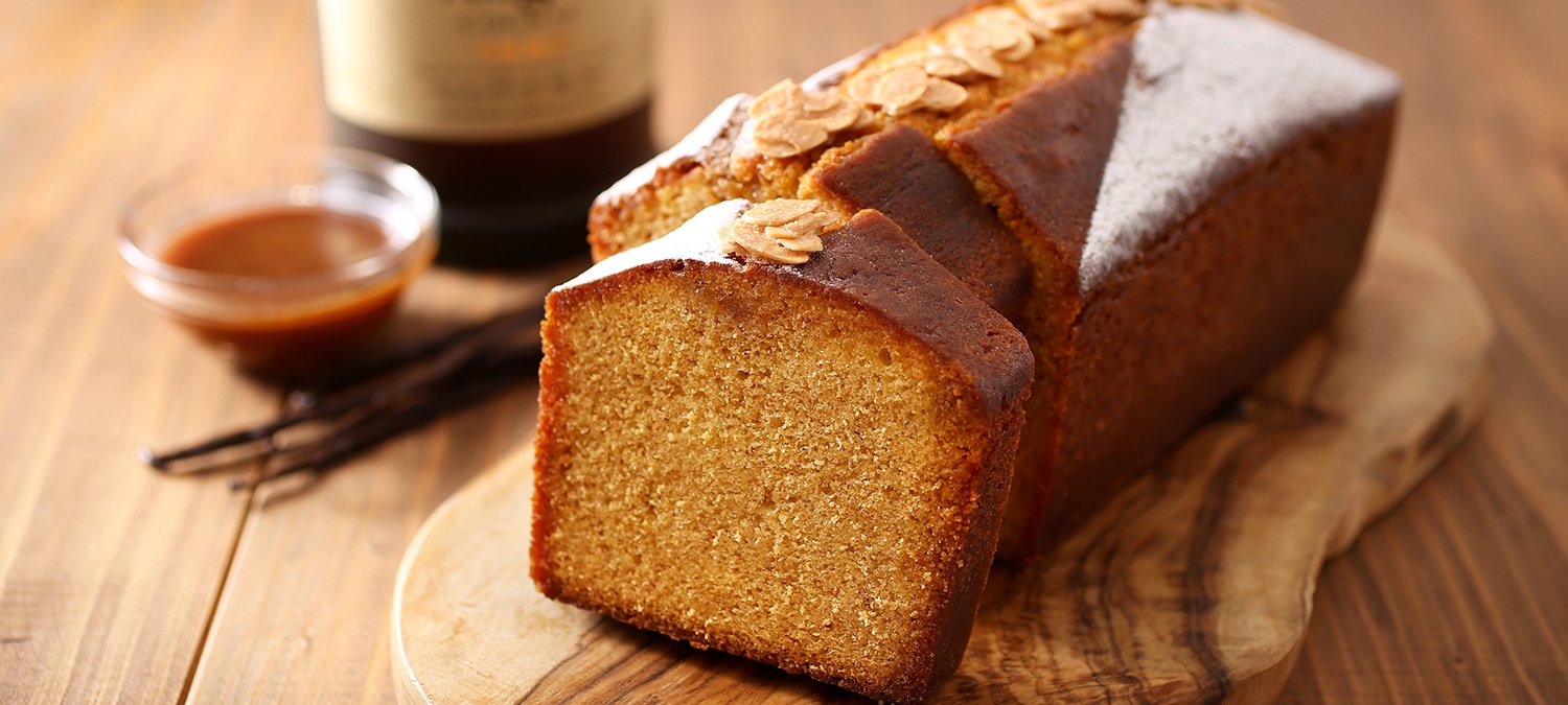 「Quatre quarts(キャトルカール)」は、フランス語で「1/4が4つ集まった」という意味を持ち、バター・砂糖・卵・小麦粉の4つを同量ずつ使用して作るブルターニュ生まれのケークのことです。発酵バターの風味豊かなキャトルカール生地に、北海道産の生クリームやゲランドの塩を使用して炊き上げたリッチな味わいの塩キャラメルと、香り高いバニラを合わせて焼き上げ、フランスの上質なブランデー“コニャックV.S.O.P.”の香りをまとわせて仕上げました。ゲランドの塩のほのかな塩味を効かせたアーモンドのマカロンを食感のアクセントに添えて。芳醇な生地の美味しさをお楽しみいただける、シンプルながらも贅沢な味わいのケークです。