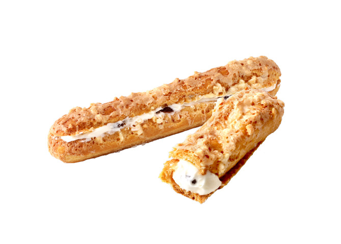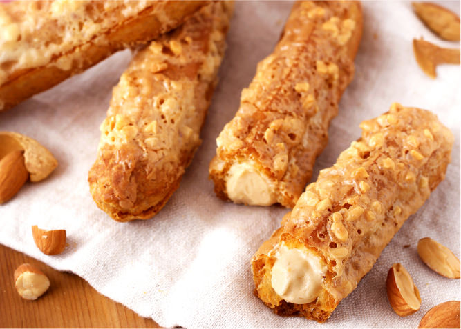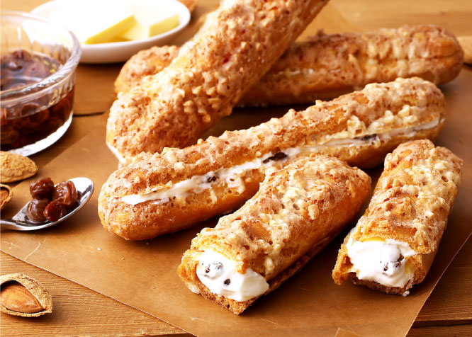 バタークリーム〉CROQUANT ÉCLAIRラム酒漬けレーズンと濃厚なバタークリームを、 アーモンドをのせて2度焼きしたざくざく食感のエクレール生地にサンドしました。